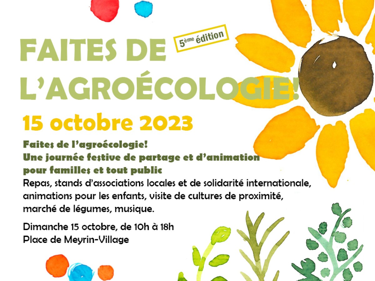 Notre fĂȘte de l'agroĂ©cologie revient pour sa 5Ăšme Ă©dition, les 15 et 16 octobre prochains. Repas, stands dâassociations locales et de solidaritĂ© internationale, animations pour les enfants, visite des cultures de la ferme des Vergers Ă Meyrin, marchĂ© de lĂ©gumes, musique, jeu-concours. -