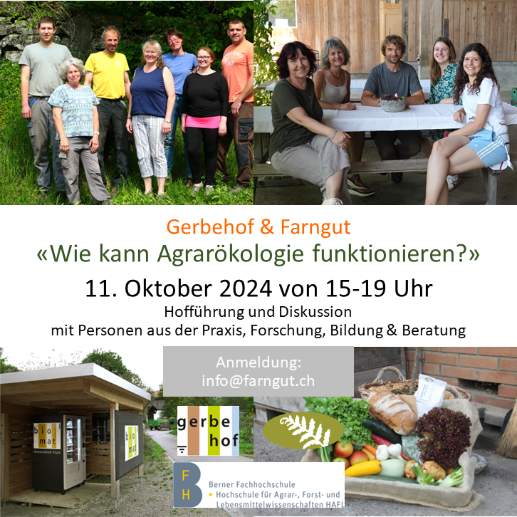 Der Gerbehof und das Farngut – zwei Betriebe mit engagierten Betriebsleitern, welche seit 27 Jahren zusammenarbeiten und Erfahrungen in der Umsetzung der Agrarökologie gesammelt haben. Sie beschäftigen sich mit der Frage: “Kann Agrarökologie funktionieren? Wie gehen wir die Herausforderungen in der Vermarktung an?” Wir diskutieren die aktuellen Hürden und Chancen der agrarökologischen Ansätze zusammen mit Dominik Füglistaller (Forschung, BFH-HAFL) und Niklaus Messerli (Bildung und Beratung). Im Anschluss gibt es ein kleines Apero mit saisonalem vom Hof und Zeit für offenen Austausch! -