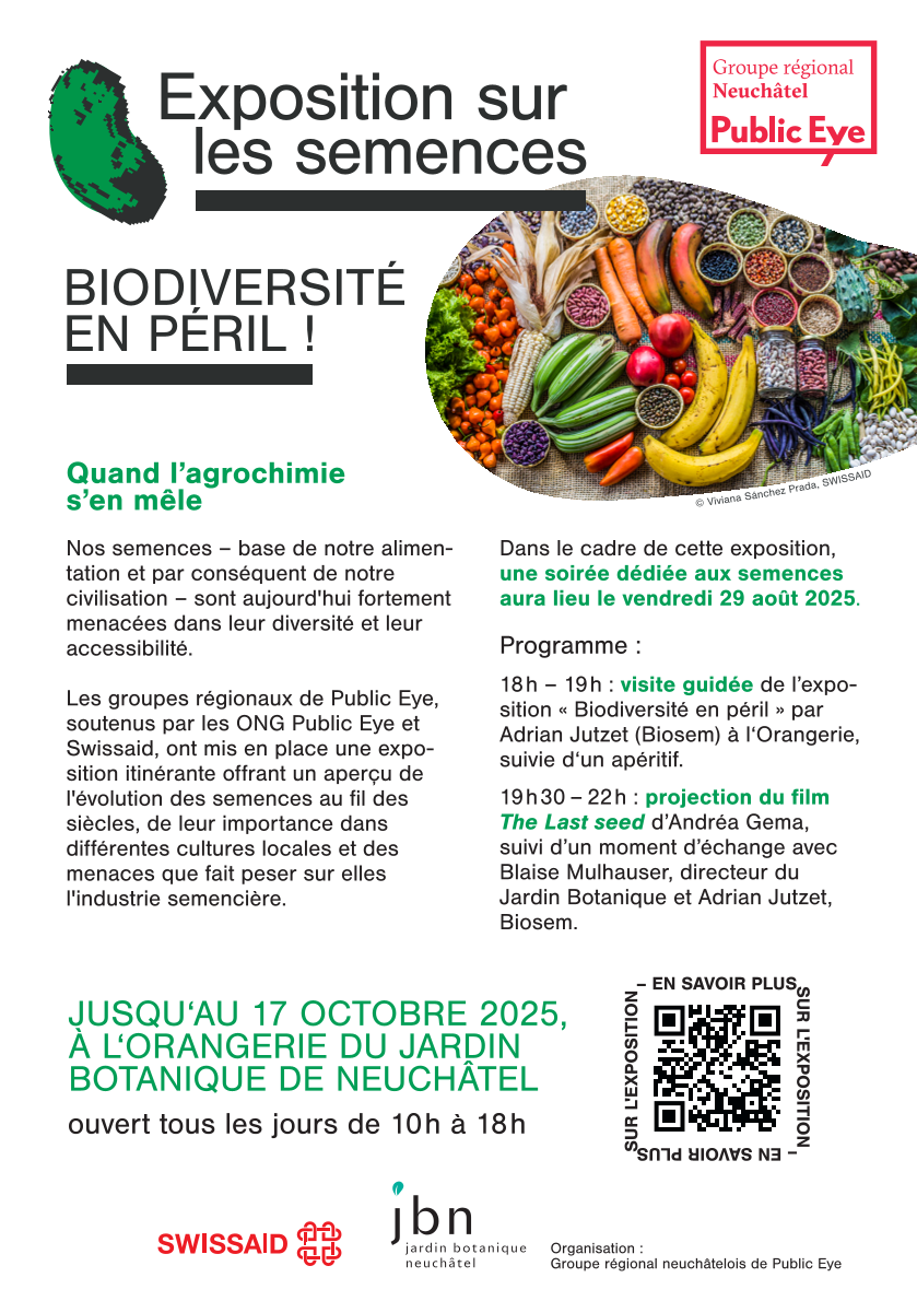 Les groupes régionaux de Public Exe, soutenus par les ONG Public Eye et Swissaid, ont mis en place une exposition itinérante offrant un aperçu de l'évolution des semences au fil des siècles, de leur importance dans différentes cultures locales et des menaces que fait peser sur elles l'industrie semencière.
