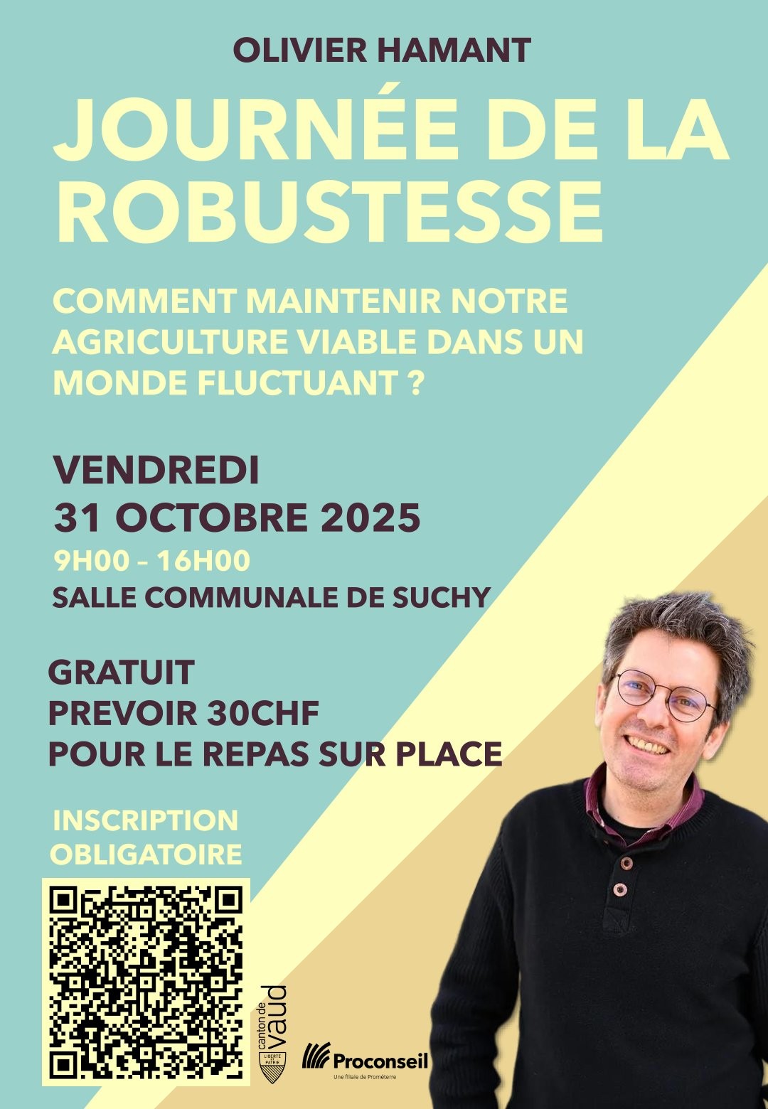 Sécheresses, aléas climatiques, perte de biodiversité : l’agriculture vaudoise fait face à de fortes incertitudes. La Direction Générale de l'Agriculture Viticulture et Améliorations foncières invite le biologiste et auteur Olivier Hamant pour une journée d’échanges afin de réfléchir à la robustesse, identifier les risques et explorer des pistes d’action pour une agriculture plus robuste.